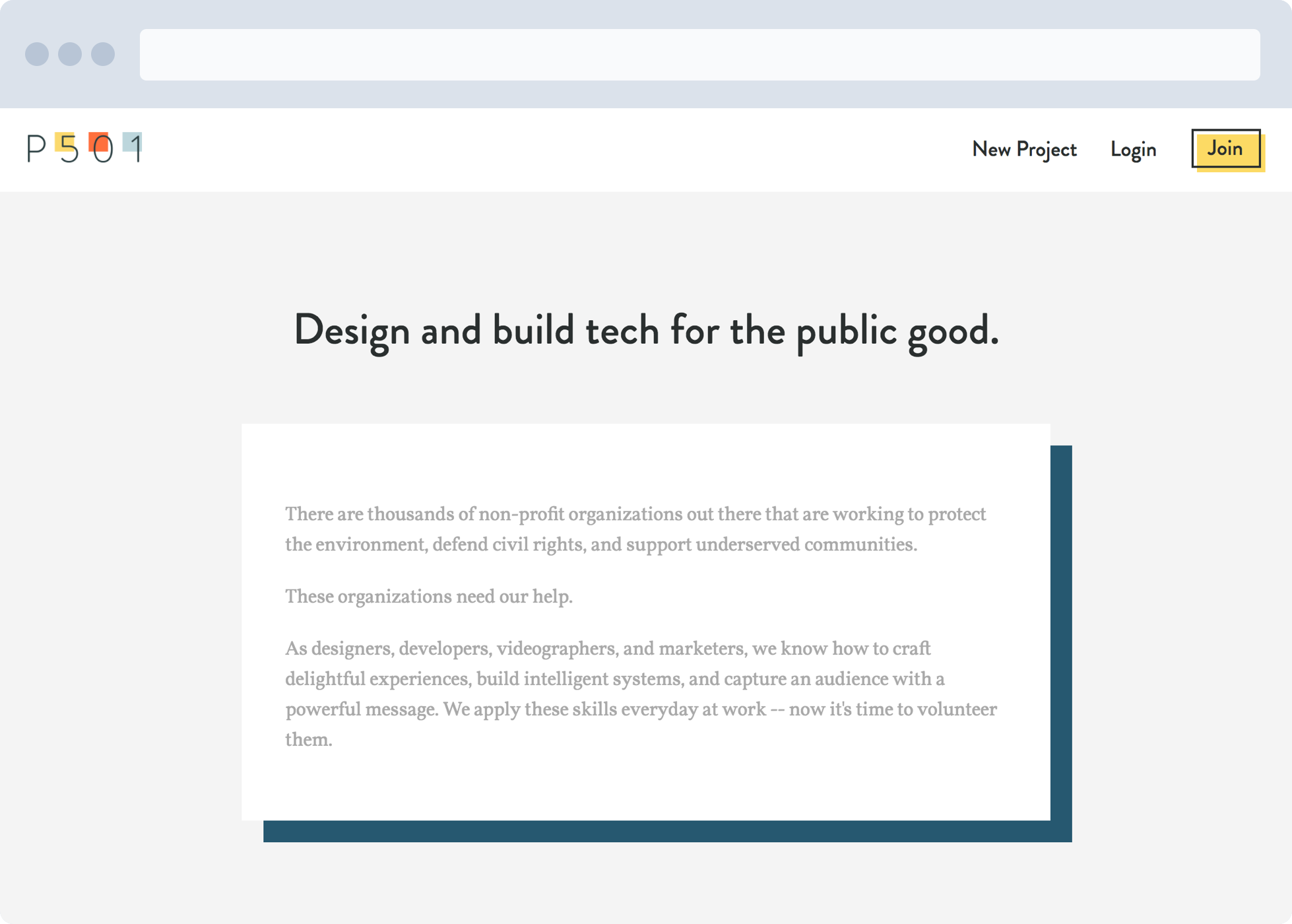 Project 501 is a platform for non-profit and socially-good organizations to connect with creative and technical volunteers.