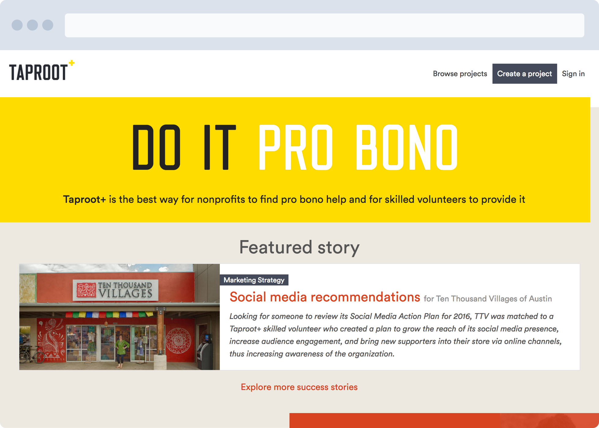 Taproot+ is an online platform built by the Taproot Foundation that helps nonprofit professionals describe their needs and connect to a curated group of motivated, ready skilled volunteers with the right skills to help.
