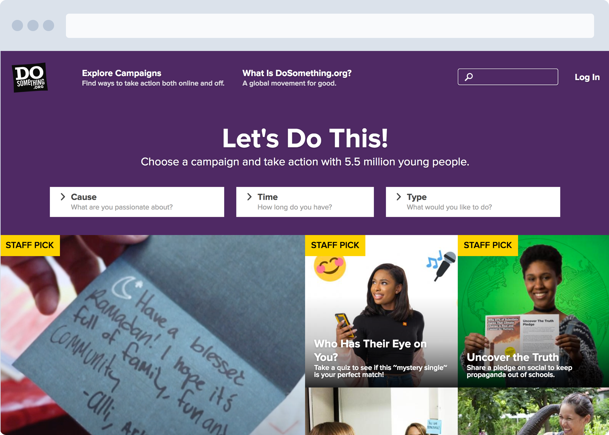We have over 5.6 million members tackling social change campaigns that impact every cause, from poverty to violence to the environment. Basically any cause, anytime, anywhere. You can search our campaigns using our campaign finder at https://www.dosomething.org to look for a campaign that matches your cause interests, how much time you have, and what kind of action you want to take (volunteer, make something, donate something, etc). If you need any help getting started or have any more questions, don’t hesitate to reach out to us!