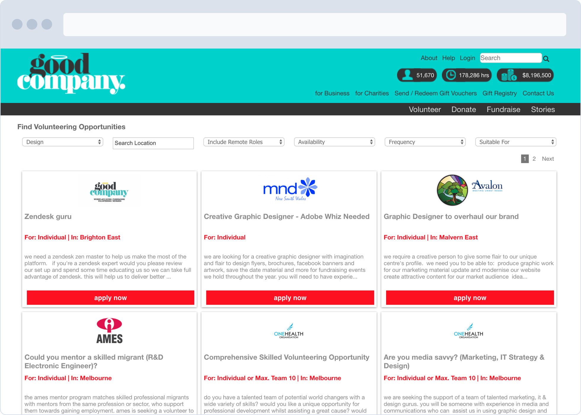 Good Company is a ‘Corporate Workplace Giving and Volunteering Platform’ based in Australia, with a selection of opportunities requiring design skills. As well as enabling employees of corporate companies give back during work time, it’s also possible to volunteer as an individual in your own time. If you can’t find the role you want, you can fill out an expression of interest form so that charities can find you too.